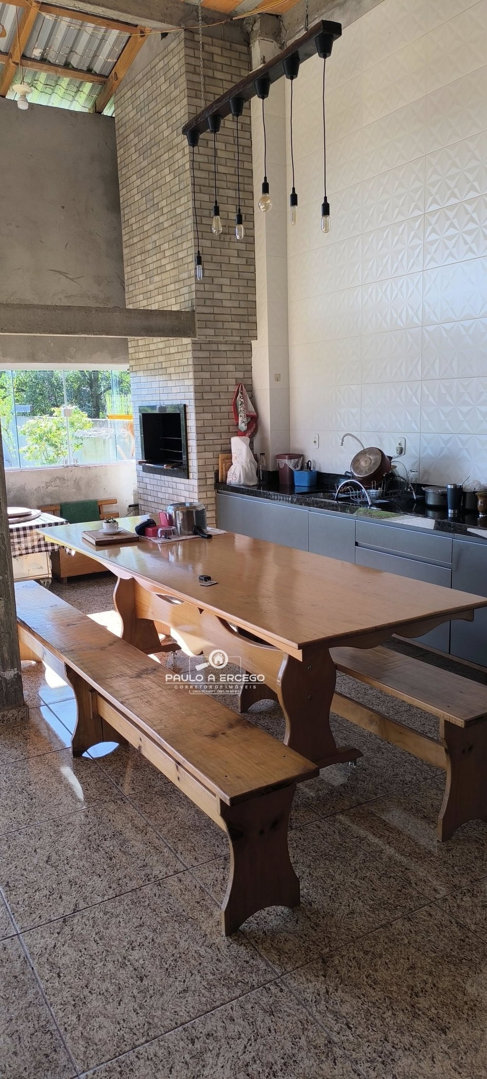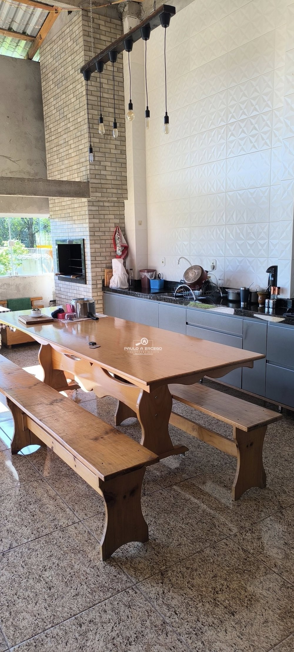 Área de festas com cozinha sob medida bem espaçosa com granito e acabamento em cerâmica 3D nas paredes.