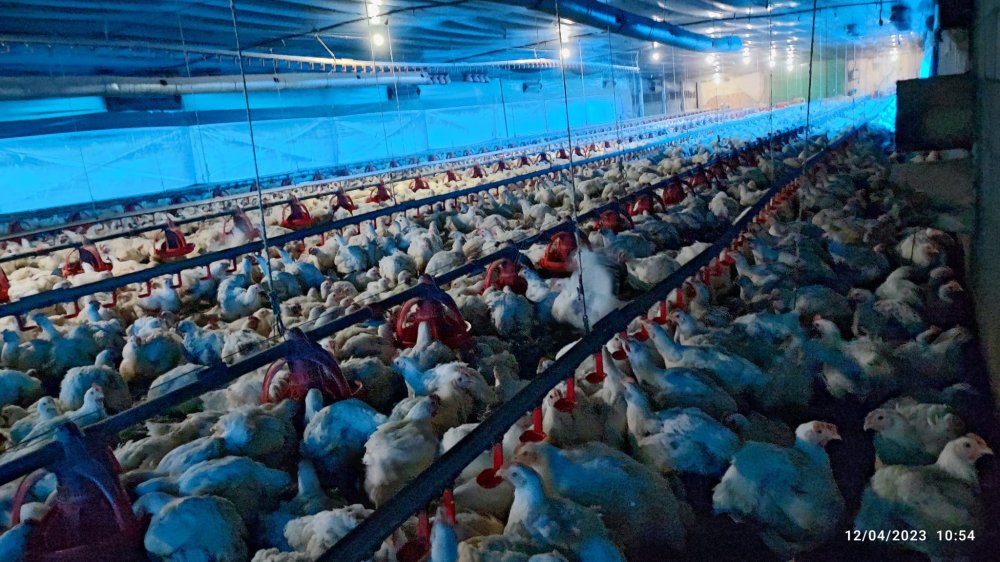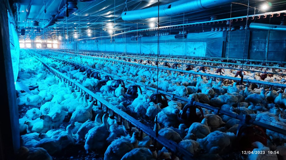 Aviários com 125 metros, com cobertura 6mm e estrutura em ferro, capacidade para alojar até 53 mil frangos no total.