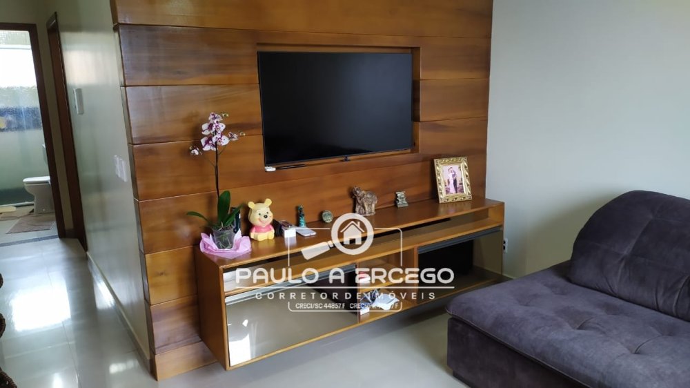 A sala conjugada com a cozinha, tem um lindo painel de tv que fica no ambiente, pra aquele momento aconchegante depois de um dia de trabalho.